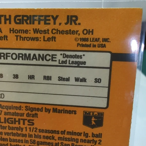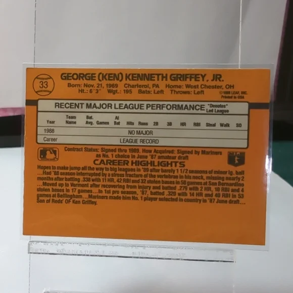 For avid collectors of baseball memorabilia, this 1988 Donruss Ken Griffey Jr. sports trading card is a rare find. The card features the rookie player in his early days, and is a must-have for any fan.With the card's unique error, it adds an additional layer of intrigue for those who appreciate the history and rarity of sports trading cards.This card has the wrong birth place on back, he was born Donora, Pa.This 1988 Donruss Ken Griffey Jr. rated rookie card is a valuable addition to any collection.The card's condition is exceptional, with all features of the card intact. The card has a unique error that is sought after by collectors, making it an even more desirable piece.Don't miss out on the opportunity to own this piece of baseball history.Questions ...just ask.Reasonable offers welcome