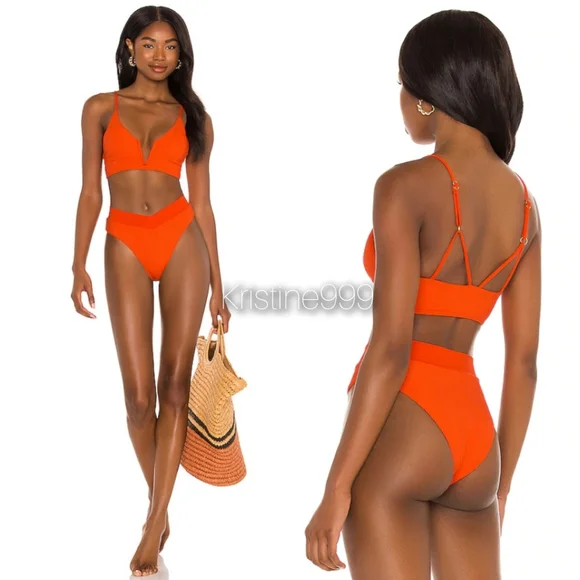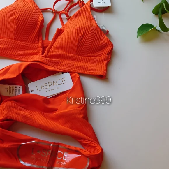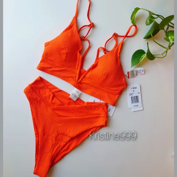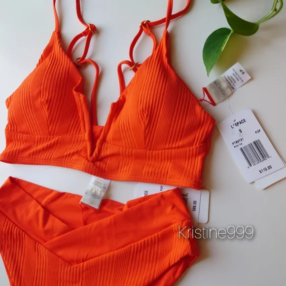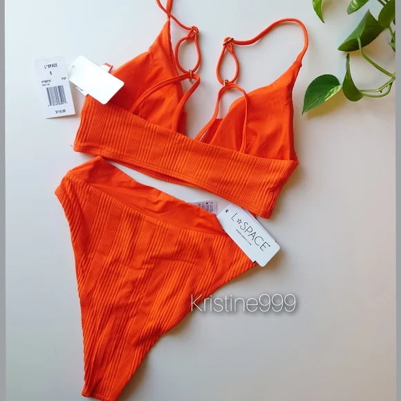 Brand New with tagsGorgeous Orange Ribbed Bikini Set by L*Space. A retro-inspired sculptural silhouette makes the Siren Top a must-have for any beach bombshell. This pullover pointelle ribbed top features a plunging V-wire front and V-detail back. Removable pads and adjustable straps lets you customize your look.Pointelle rib fabric pullover silhouette topV wire frontAdjustable straps with V detail in backRemovable padsComes with matching Court Bottoms featuring high waist, super flattering V front, high leg cut with bitsy coverage. Made in USA#lspace #vitaminA #revolve #shopbop #anthropologie #weworewhat #fashionblogger #faithfullthebrand #reformation #triagl #asos #uo #freepeople #maaji #trinaturk #beachriot #acacia #bondeye #onia #solid&striped #toripraver