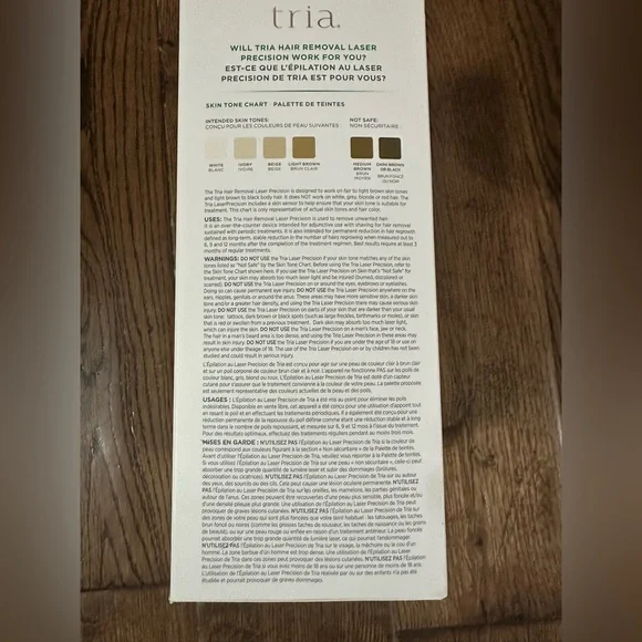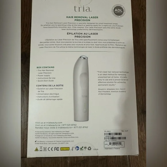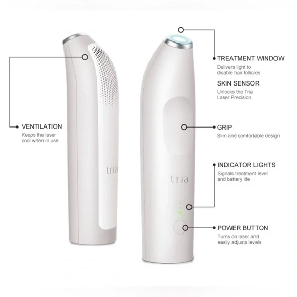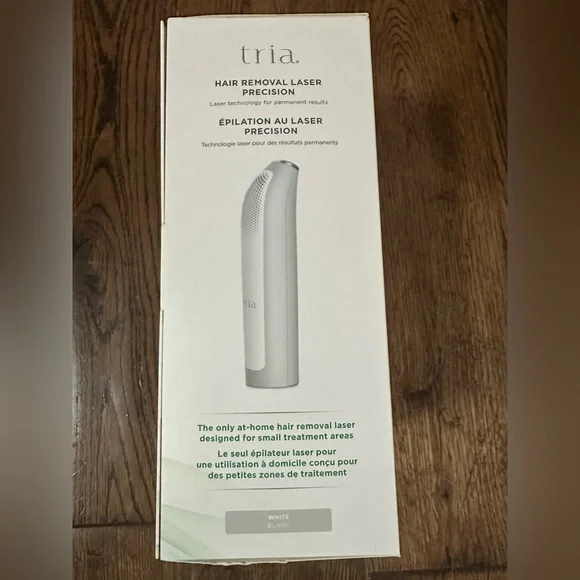 The Tria Hair Removal Laser Precision is designed for at-home use, targeting small, sensitive areas like the bikini line, underarms, and face. It uses diode laser technology, which is clinically proven to be 90.1% more effective for hair removal than IPL treatments. This laser targets the melanin in the hair follicle, disabling its ability to regrow hair permanently. Key features include:Permanent Results: Aims for long-term hair reduction. Precision: Designed for small, sensitive areas. FDA-Cleared: Approved for safe and effective home use. Clinical-Grade Technology: Uses the same diode laser technology preferred by dermatologists. Power: It's 4x more powerful than IPL devices. Treatment Time: Up to 73% hair reduction after two treatments, with up to 100% after a full course. Skin Tone Compatibility: Effective on skin tones between pale and light tan, and on light brown to black hair. The Tria Precision model is smaller and lighter than the Tria 4X, making it ideal for targeted treatments. ERGONOMICS: Easy to use, especially when it comes to curves and angles in small, hard-to-reach areas.Other Details:Using the Tria Hair Removal Laser as directed for at least 8 treatments, most users will achieve a substantial visible reduction in hair regrowth, and additional treatments may result in additional reductions.***Purchased new from retailer for $590.Message me if you have any questions. Thanks for looking!