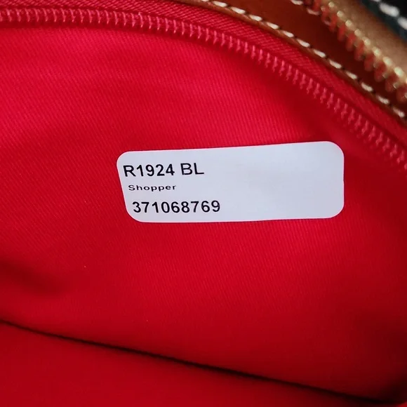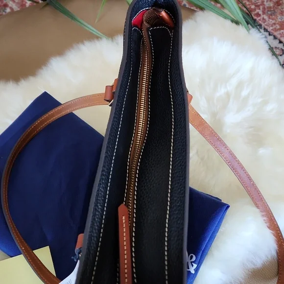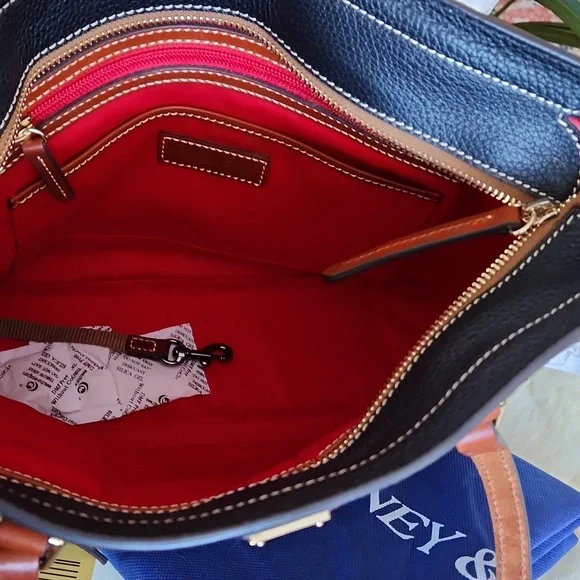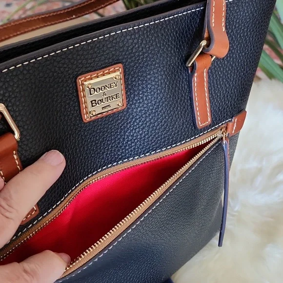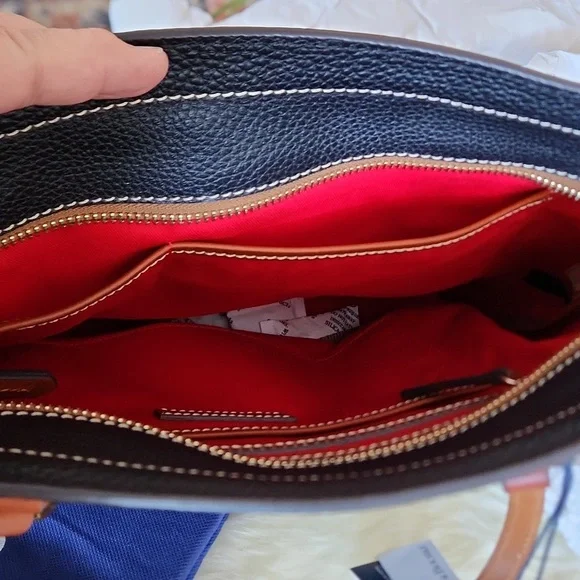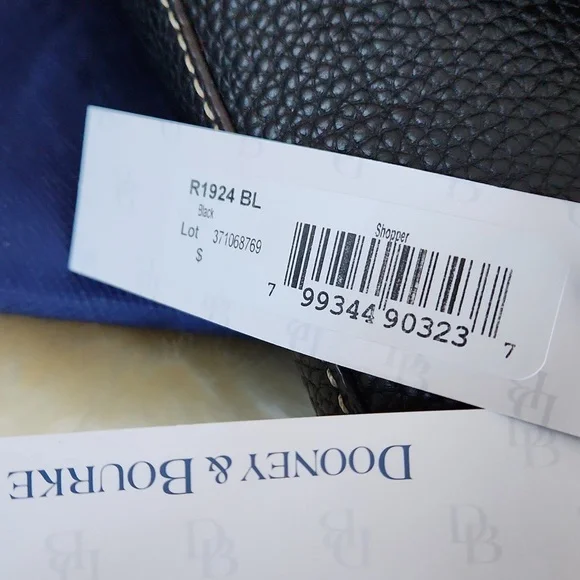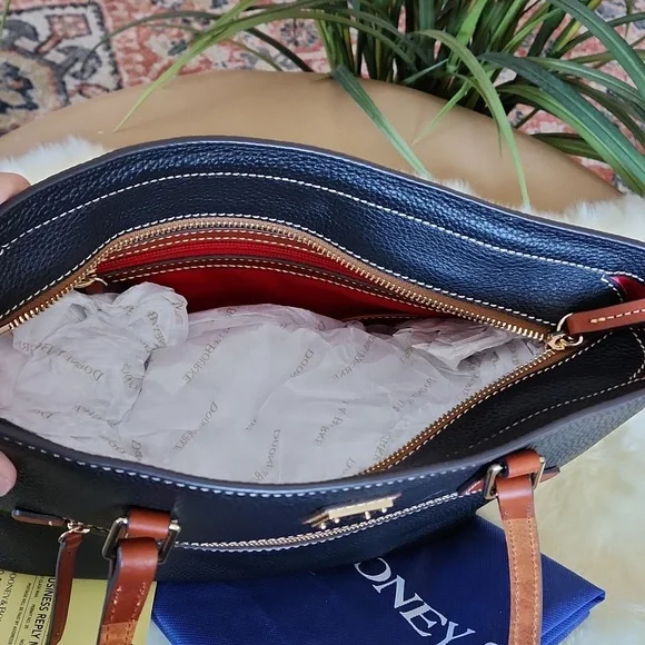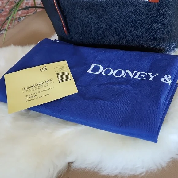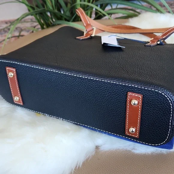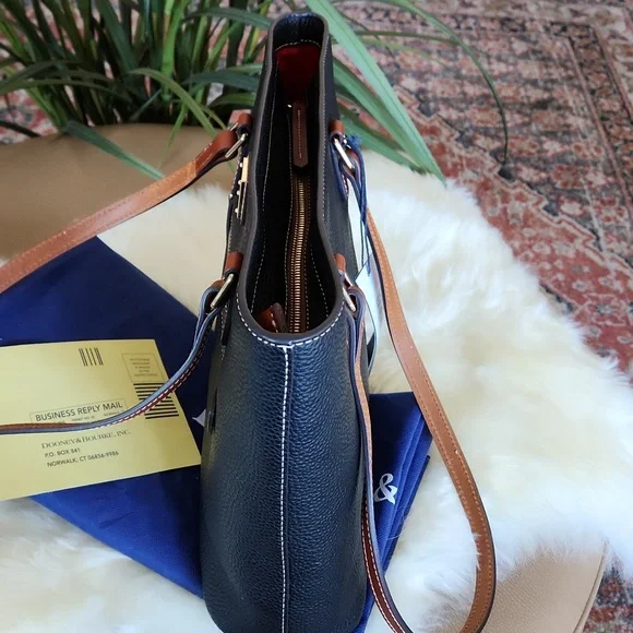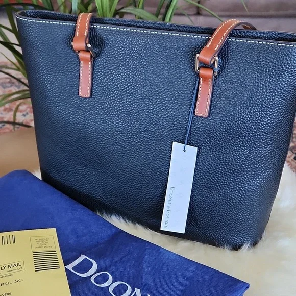 Beautiful new with tags Dooney & Bourke black and tan leather Shopper Tote is in excellent new condition. Tags, dust cover, packing materials, and registration card are included. Gorgeous soft dark black pebbled leather with medium tan straps and trim and gold logo badge and hardware. Front zippered phone pocket for easy access and top zipper closure. Inside has 1 zippered and 3 open sidewall pockets and classic key keeper fob. Bag measures approximately 13" wide by 10 1/4" tall. The perfect size is not too big but not too small to carry everything you might need! Guaranteed authentic. From non-smoking home. 🖤🎁🤎
